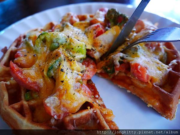 德式香腸披薩鬆餅,上面的餡料我覺得還滿多的,但是起司有點少,料一直掉下來,最後鬆餅跟料有點分離了...