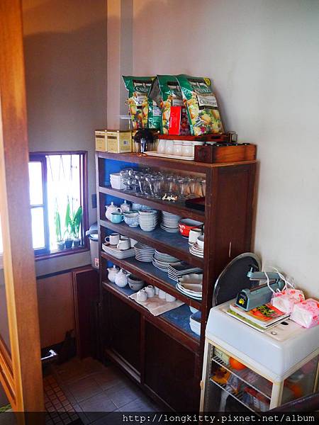 一上了二樓會先看見一個老櫥櫃,裡面整齊的擺放著餐具,然後轉彎看見的是廚房,非常小。