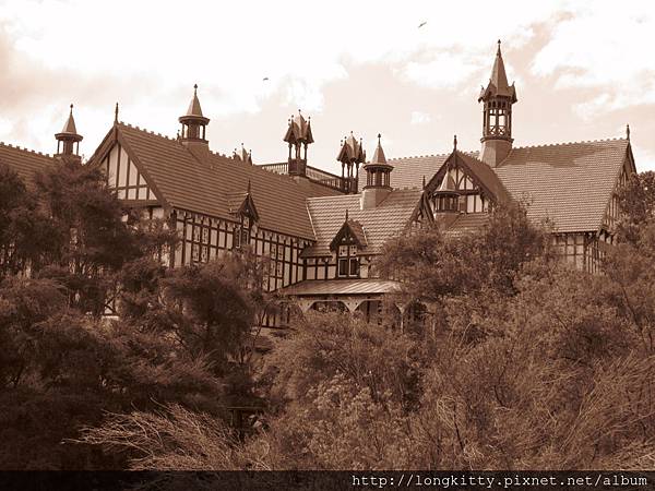 Rotorua Museum,從左後方繞過去照出來的,像是埋在森林的古堡。
