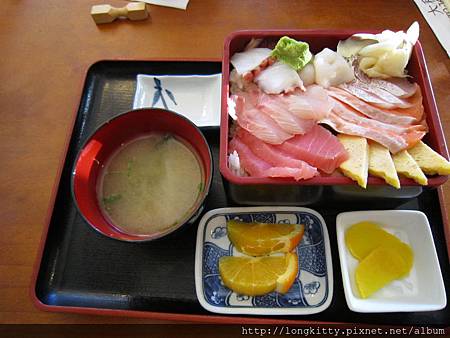 豪華版的,多了干貝跟章魚,一樣附湯跟小菜水果。